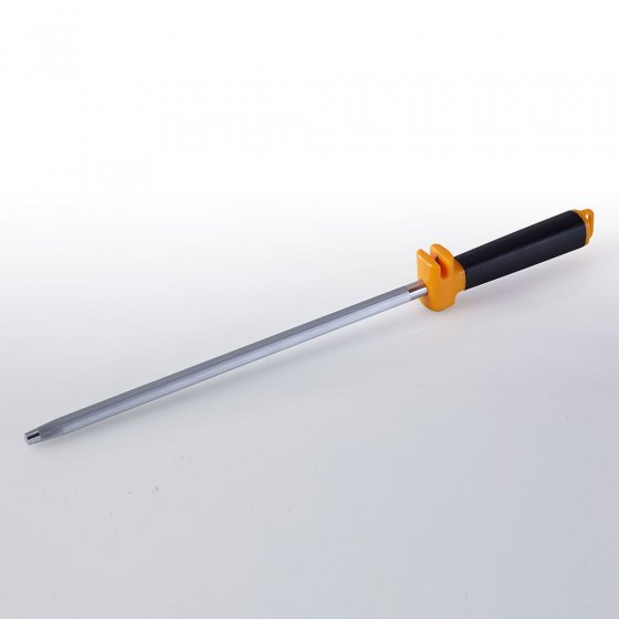 Vaarwel botte messen: met het AANZETSTAAL MET MESSENSLIJPER kunt u alle soorten messen (keuken-, zak- en gewone messen) weer scherp maken! Trek zeer botte messen door de gleuf van de messenslijper op het handvat, waar ze opnieuw worden bewerkt en gevormd met slijpers van wolfraamcarbide. Met de staaf van koolstofstaal worden de kleinste oneffenheden gladgestreken zonder materiaal te verwijderen. Een paar keer is voldoende om de oorspronkelijke scherpte te herstellen. De rubberen handgreep garandeert te allen tijde een veilige grip. Afmetingen (l x b x h): ca. 46 x 3 x 5 cm. Vanaf nu behoren messen die de neiging hebben het te snijden materiaal te pletten of te scheuren tot het verleden.