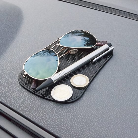 Geen magie. Geen truc. Bij deze flexibele, siliconenachtigemat blijft bijna alles vastliggen: mobiele telefoons, brillen,sleutels, munten blijven millimeterprecies liggen,waar u het wilt. Afmetingen: 14 x 9 x 0.3 cm.Ook ideaal in de badkamer, kantoor en keuken.