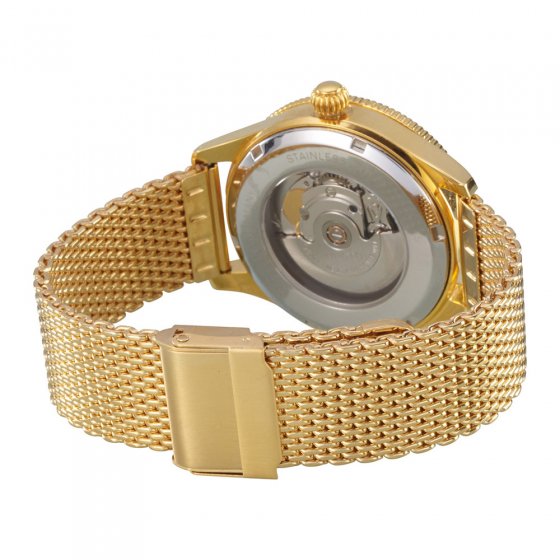 Geniet van ongeëvenaarde luxe! Het majestueuze AUTOMATISCH HORLOGE ERBPRINZ 'GOLD' is een hoogkaraats model van de beroemde horlogemaker Aristo Vollmer uit Pforzheim: kast en wijzerplaat van dit voornamelijk met de hand vervaardigde model zijn galvanisch met een goudlaagje veredeld. Bovendien heeft dit kunstwerk met chique Breguet-wijzers een gecanneleerde duikerring en een vergulde Milanese-armband, die dankzij de schuifsluiting om elke pols past. Om dit sieraad met het Zwitserse automatisceh uurwerk ETA 2824-2 uw eigendom te kunnen noemen, is haast geboden, want het aantal is gelimiteerd op 100 exemplaren. Elke horloge wordt geleverd met certificaat en inscriptie, die de echtheid garanderen. Afm.: (Ø/h): ca. 40/10 mm. Gewicht: ca. 110 g. Bij dit horloge is werkelijk alles goud wat er glanst.