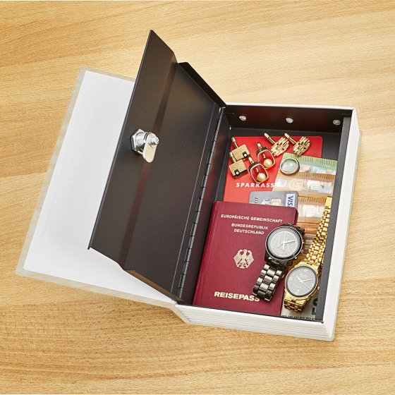 Een geheime opbergplek, die groot genoeg is voor uw belangrijkste kostbaarheden maar die ook onopvallend is: deze BOEKCASSETTE MET CILINDERSLOT "ROME" beschermt zelfs grotere kostbare spullen tegen nieuwsgierige blikken en grijpgrage handen. In de stijl van een Italiaanse reisgids, met afsluitbare metalen cassette tussen de opklapbare deksels – inclusief 2 sleutels. Dankzij de authentieke en hoogwaardige look is deze ingenieuze opbergplek niet van een echt boek te onderscheiden! Afmetingen (l x b x h): ca. 23,5 x 15, 5 x 5,5 cm. Camoufleer uw sieraden, horloges, contant geld en documenten met uw voorliefde voor stedentrips.