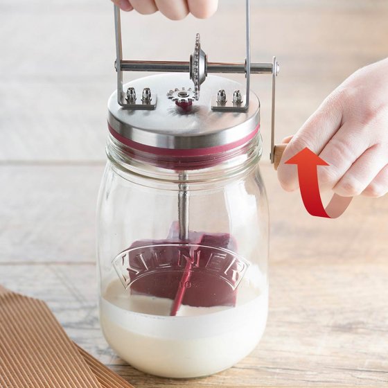 Hier weet u precies wat erin zit. Met de BOTERKARNER maakt u snel en eenvoudig uw eigen boter. Gewoon room die op kamertemperatuur is in het reservoir doen en ronddraaien. De room wordt steeds dikker en tot slot boter. Als bijproduct ontstaat lekkere karnemelk, die u vers kunt drinken. En dat kan allemaal in minder dan 10 minuten. Naar wens kunt u uw boter nog met kruiden en specerijen op smaak brengen, ideaal voor een volgend feestje. Afmetingen (H x Ø): ca. 27 x 10 cm. 300 ml room is voldoende voor ca. 110 g boter. Ook vrienden of de kleinkinderen zullen deze traditionele manier van boter bereiden erg leuk vinden.