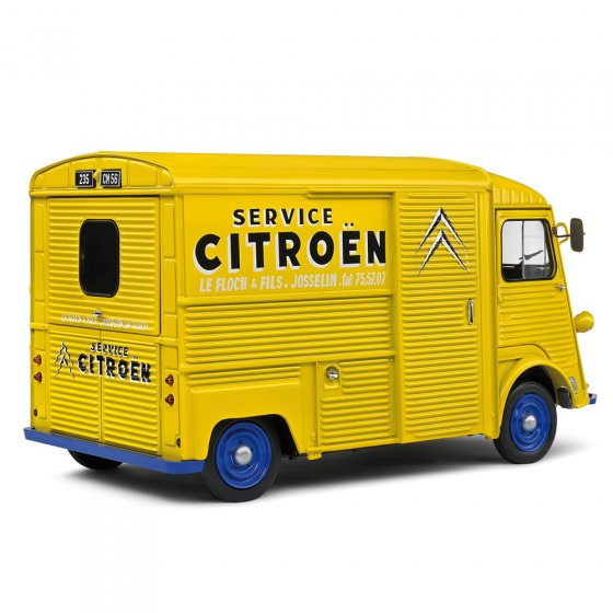 De bijzondere HY, nog in de oorlog ontworpen en gebouwd tussen 1947 en 1981, is een toonbeeld van waar vernuft: dankzij de gegolfde structuur van zijn carrosserie was hij uiterst stabiel, zodat hij een groter gewicht kon transporteren dan hij zelf woog! Door hem kwamen er ontelbare versies – van de ambulancewagen tot diverse brandweer- en politievoertuigen en meubel-transportwagens. Het 1:18-model CITROËN HY "CITROËN SERVICE" van zinkdrukgietwerk is hier uitgevoerd als servicevoertuig. De voordeuren en de achterklep kunnen opengeklapt worden, de vooras is beweegbaar. Afm. (l x b x h): ca. 23 x 11 x 19 cm. Vul uw collectie aan met deze minimalistische kanjer!