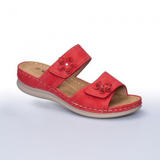Supercomfortabele slippers met 2 klittenbandsluitingen voor snel aan- en uittrekken en een nauwkeurige aanpassing aan de voet. Met mooie siernaden, een luchtdoorlatende, zachte, genaaide binnenzool voor een bijzonder voetklimaat en prettige hakhoogte en een prachtige bloemapplicatie. Slippers van veganistisch leer met softtouch-zool. Standaardwijdte G.