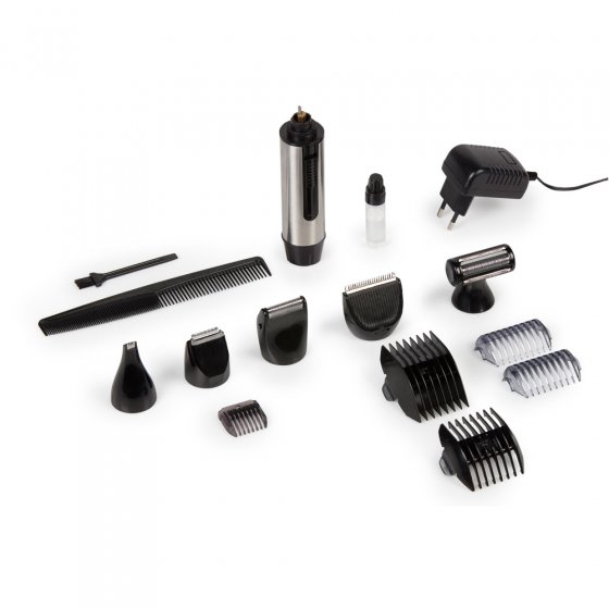 Hecht u waarde aan een verzorgd uiterlijk – met name waar het gaat om kapsel en lichaamshaar? Wanneer u uw kapsel en/of baard tussen twee kappersbezoeken door zelf piekfijn in orde wilt houden (of als u altijd uw eigen haren knipt), biedt deze COMPLETE KAPPERSSET u daar alle mogelijkheden voor: u kunt uw hoofdhaar ermee knippen, de baard trimmen, oor- en neusharen verwijderen en zelfs ander lichaamshaar verwijderen. Met roestvrijstalen mesjes en 5 verschillende scheerkoppen. Werkt op een accu (ca. 30 min. bij een volle accu). Afmetingen: Ø ca. 3 cm, lengte ca. 17 cm. Voor de man die er graag verzorgd uitziet!