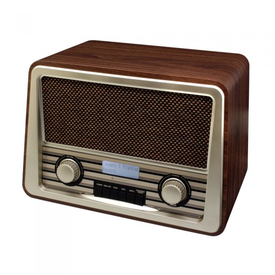 Rechthoekige houten kast, met stof bespannen luidsprekerfront, echte draaiknop: zo zagen buizenradio's eruit in de jaren 50. Precies dit nostalgische design is vandaag de dag weer helemaal populair – maar niet de verouderde ontvangsttechniek! De DAB+-RETRORADIO heeft daarom een eigentijdse binnenkant: digitale/FM-tuner met elk 10 geheugenplaatsen voor voorkeuzezenders en RDS-functie, automatisch zenders zoeken, lcd-scherm met blauwe achtergrondverlichting. Werkt op 230 V of mobiel via 4 C-batterijen (afzonderlijk te bestellen). Met telescoopantenne. Afm. (lxbxh): ca. 30 x 20 x 20 cm. Met deze radio bent u helemaal up-to-date – zowel in optisch, als in technisch opzicht.