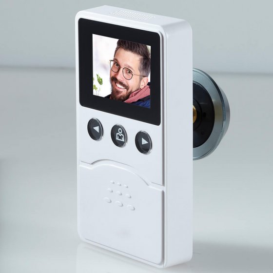 Wilt u graag weten wie er aanbelt – vooral wanneer u niet thuis bent? Deze DEURSPION MET OPNAMEFUNCTIE verschaft u duidelijkheid! Hij functioneert als een digitale camera: gebruikt iemand de bel bij de spion, dan wordt er een snapshot gemaakt. Als u thuiskomt, kijkt u de opgeslagen beelden in alle rust terug. Bent u thuis wanneer er aangebeld wordt, dan kunt u het apparaat als een normale deurspion gebruiken. Werkt op 3 AA-batterijen (afzonderlijk te bestellen). Afmetingen (beeldscherm, b x h x d): ca. 8 x 14 x 2 cm. Voor deurdikte van 37 tot 65 mm. Krijg een beeld van uw bezoekers!