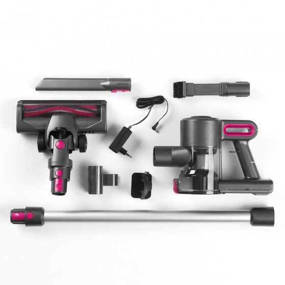 Accu-cycloonstofzuiger, verlengbuis, zuigmond, kierenzuigmond, meubel- & borstelzuigmond, netadapter, wandhouder inclusief bevestigingsmateriaal, accu: 22,2 V (Li-ion-accu, 2200 mAh).