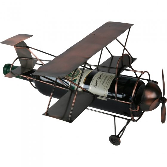 Welke flessen met geestrijke dranken u ook in uw collectie hebt: er is vast en zeker één die uw voorkeur heeft – misschien omdat het edele vocht u bijzonder aanspreekt of omdat deze fles u herinnert aan (of juist doet uitkijken naar) een bijzonder moment. Verberg deze fles niet in een donkere kelder, maar zorg dat hij gezien wordt: deze met de hand gemaakte FLESSENHOUDER 'VLIEGTUIG' van koperkleurig metaal maakt van iedere fles een presentatie-object – zowel op tafel als op een wandmeubel. Afmetingen (lxbxh) 34 x 27 x 17 cm. Tip: natuurlijk is de flessenhouder ook zeer geschikt als geschenk!