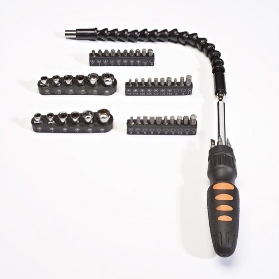 Sommige schroeven zijn er met een normale schroevendraaier gewoon niet te bereiken – hoe je hem ook draait of keert. Daar helpt de FLEXIBELE SCHROEVENDRAAIER: hiermee kunt u ook schroeven die om een hoekje geschroefd zijn eruit of erin draaien, want hij kan “om een hoekje” draaien! Dankzij een interne as draait de buitenzijde niet mee. Extra voordeel: De krachtoverdraging wordt nog verveelvoudigd. Gemaakt van carbonstaal, de rubberachtige greep van kunststof. Het flexibele opzetstuk kan worden verwijderd. Afm.: lengte (met opzetstuk) ca. 49 cm, Ø ca. 3,5 cm. Met dit gereedschap bereikt u iedere schroef – ook die in het achterste hoekje!
