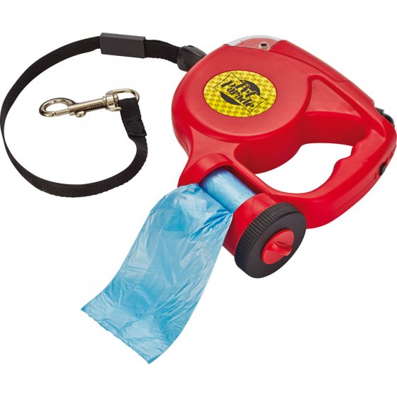 Ongeacht of u met een gehoorzame hond of een speelse vuilnisbakkenras puppy op pad bent – de HONDEN-ROLLIJN MET LICHT EN POEPZAK betekent voor hond en baas extra zekerheid! De rol-lijn met stop- en oprolfunctie zorgt ervoor dat u uw lieveling altijd perfect onder controle heeft. En het beste is: U bent nooit meer "zonder"! Want, in de ergonomisch gevormde houder zit een praktisch vakje voor de onmisbare poepzak. Gewoon zoals bij een rolhouder van de rol af trekken, afscheuren – en u heeft een hygiënische zak gereed! Ook bevat het een geïntegreerd en helder schijnende zaklamp. Donkere paden en oneffen terrein zijn met deze hondenrollijn dus ook geen probleem meer. Werkt op twee AA-batterijen (apart verkrijgbaar). De ca. 5 m lange lijn voor honden t/m ca. 25 kg met karabijnhaak, is bovendien voorzien van een reflectorband. Zo struikelen joggers en š etsers in het donker niet over uw lijn! Onze tip voor pientere baasjes: Zorg meteen voor een voorraadje reserve zakken (10 st. per rol)!