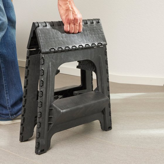 Pak iets van de bovenste kastplank of vervang de lamp van de plafondlamp: daar hoeft u de trapladder niet voor te gebruiken. Het beproefde INKLAPBARE OPSTAPJE is alles wat u nodig hebt! Dankzij tussentreden aan beide zijden is deze versie nog gemakkelijker te gebruiken dan zijn voorganger; de antislipstructuren van het oppervlak zorgen voor een veilige grip. Na gebruik kunt u het opstapje eenvoudig inklappen en in een nis opbergen om ruimte te besparen. Omdat hij gemaakt is van zeer stabiel, maar zeer lichte kunststof, kan hij snel worden uitgeklap en even snel weer worden opgeborgen. Afmetingen (uitgeklapt, bxhxd): ca. 41 x 40 x 45 cm. Zo komt u stap voor stap op een hoger niveau!