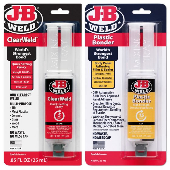 JB WELD CLEAR is een speciaal ontworpen twee-componenten lijm die stoffen sterk en onzichtbaar bindt. Hij kleeft naast de meeste kunststoffen en plasticmaterialen, ook hout, glas, keramiek, metaal of tegels. JB PLASTIC BONDERS is een ideale twee-componenten lijm voor het repareren, vullen, sealen en binding. Hij repareert niet alleen zuivere kunststof, maar ook geplasti ceerd metaal, beton en andere materialen. De nieuwe spuittechniek geeft de ideale 1:1 mengverhouding. Door gelijkmatig indrukken van de zuiger komt epoxyhars en verharder (12,5 ml) uit met dezelfde hoeveelheid, die direct met elkaar gemengd worden in de Mix trog in de verpakking. Het vereist geen speciaal meten-of mengen. Overtuig uzelf van de onovertroffen hechtkracht van deze nieuwe producten uit het huis van JB Weld.