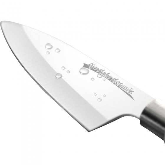 De Japanse keuken staat bekend om de flinterdunne plakjes vlees, vis en groenten. Geen wonder, want de Japanse keukenmessen worden als de scherpste ter wereld beschouwd! Met de KERAMISCHE MESSENSET 'KYU KABU' kunt ook u snijden, schillen, raspen en fileren als een echte Japanse topkok. Want de zeven keramische messen zijn naar Japans voorbeeld gemaakt. Het extreem scherp geslepen lemmet is gemaakt van gesmeed en gehard staal. Daarnaast hebben ze een witte keramische BIOLON antikleef-coating, waardoor de afgesneden plakjes niet aan het lemmet blijft plakken. De ergonomische heften zijn van wit kunststof; het wit gelakte houten messenblok is voorzien van een beschermende plaat en een voet. Inkepingen in de onderkant van het blok zorgen ervoor dat vocht kan ontsnappen en de messen niet kunnen roesten. Afmeting (l x b x h): ca. 21 x 13 x 36 cm. Messcherp snijden op z'n Japans!