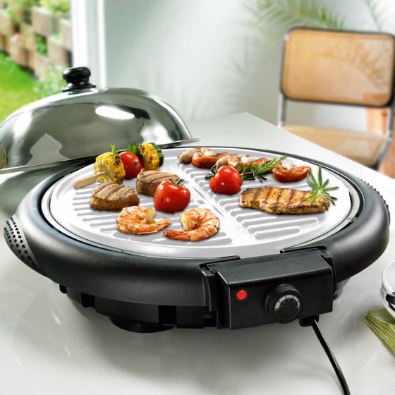 Geen rook, geen as, geen kolen meer: Deze unieke en veelzijdige KERAMISCHE STAND- EN TAFELBBQ is een super schoon apparaat! De standaard is te verwijderen: Ideaal voor BBQ-party’s op balkon of terras – of in huis! De extragrote BBQ-plaat met hoogwaardige BIO-LON keramische antiaanbaklaag biedt genoeg plek voor grote stukken vlees – of om twee kippentjes tegelijkertijd te grillen! Zonder vettoevoeging maakt u zo gezonde en ook lekkere gerechten klaar. De roestvrijstalen gaar-deksel met zichtvenster houdt het warmteverlies op een minimum en verhindert het uitdrogen van het voedsel. Het maakt ook het gelijktijdig BBQ en stomen mogelijk: Door toevoeging van wijn, bier of kruiden in de container krijgt u exclusief smakelijk