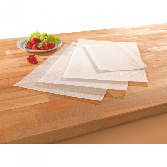 Wees eerlijk: Hoe vaak wast u uw koelkast uit? Dit werk voelt voor bijna iedereen als hinderlijk. Helaas, verzamelen zich in de koelkast, altijd fruit en salade restjes, kaas kruimels en dergelijke. De KOELKAST MATTEN maken u het reinigen eenvoudig – liggen er restjes op, dan kunt u gewoon de matten schoonmaken in de vaatwasser. Bijkomende voordelen: De matten ontnemen de luchtvochtigheid en de groei van geur veroorzakende bacteriën. Groenten en fruit blijven langer vers en knapperig! De matten worden geleverd als een set van 4 (3 matten 29 x 45 cm, 1 mat 29 x 23 cm), elke mat kan op maat gesneden worden. Ideaal voor de brooddoos! Zorg nu voor langdurige frisheid in de koelkast!