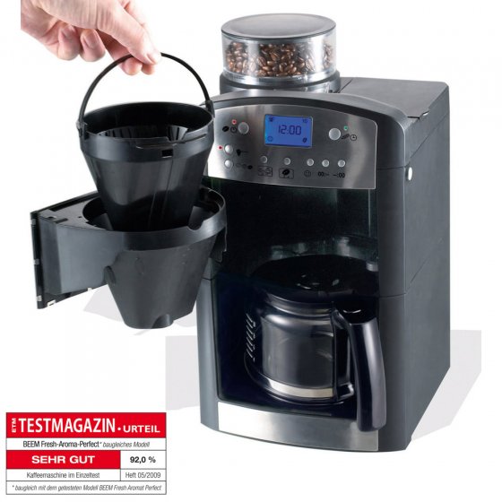 Gewoon ’s avonds de timer zetten en het uitermate stille, van gehard staal gemaakte conische molen maalt op de gewenste tijd de koffie vers. Afm.: ca. 24 x 40 x 25 cm. Aromakeuze in 3 stappen. 125 g voorraad reservoir voor bonen. 1,7 liter watertank met vul-stand-weergave. Met geïntegreerde kalkfilter, lcd met tijd, anti-druppel-systeem en praktische spoelbare zwenkfilter voor de standaard filterzakjes nr. 4. Naar keuze met maal- en zet- of slechts met zetfunctie. Voor wel 10 kopjes. Zo kunt u uw familie, uw gasten en natuurlijk uzelf eens echt verwennen!