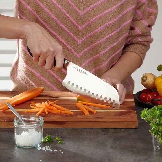 Dit KOKSMES CHAI DAO is het belangrijkste snij-instrument voor groenten, salade en fruit in de Chinese keuken. Het is een combinatie van het Japanse santokumes en het Westerse koksmes: het grote, zeer scherpe lemmet met grote snijradius is ook ideaal voor het hakken van kruiden, maar dankzij de lengte is ook het snijden van vlees geen probleem. Het lemmet van deze Chai Dao is gemaakt van hoogwaardig Duits messenstaal (hardheid: HRC 57), de greepschalen zijn gemaakt van antiseptisch G10 laminaat (= glasvezel + epoxyhars). De U-Grip-uitstulping aan het uiteinde van de mesbasis zorgt voor een goede grip. Totale lengte: ca. 30 cm (lemmetlengte 18 cm). Trakteer uzelf op dit meesterlijke koksmes!
