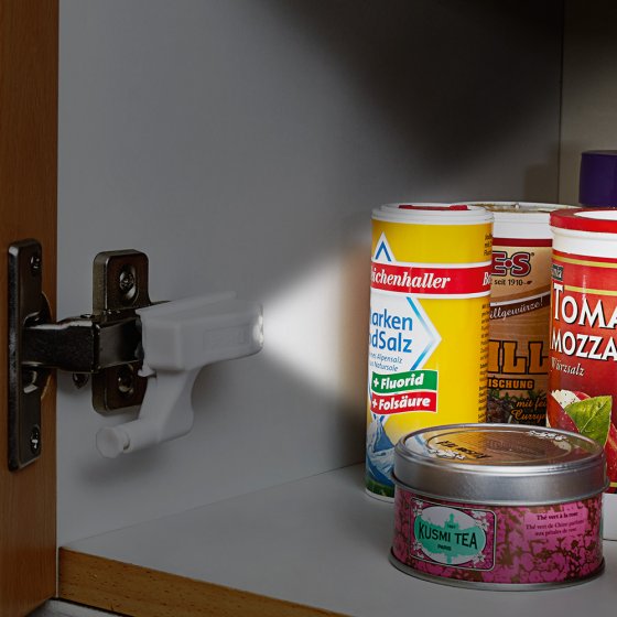 Open de kastdeur en de binnenkant van de kast wordt als bij toverslag verlicht – is dat niet praktisch? Hiervoor hoeft u geen gaten te boren of kabels aan te brengen. De LED-SCHARNIERVERLICHTING, is te bestellen als set van 4 of set van 8, is in een oogwenk op alle gangbare kastdeurscharnieren vast te schroeven. Dankzij de geïntegreerde contactschakelaar schakelt het licht vervolgens automatisch in en uit met het open en dicht doen van de kastdeur. Werkt op batterijen (inclusief). Afmetingen (l x b x h): ca. 7 x 4 x 3 cm. Vanaf nu kunt u in uw kledingkast alle overhemdkleuren direct goed zien en vindt u in het keukenkastje ook het potje kruiden dat helemaal achterin staat.
