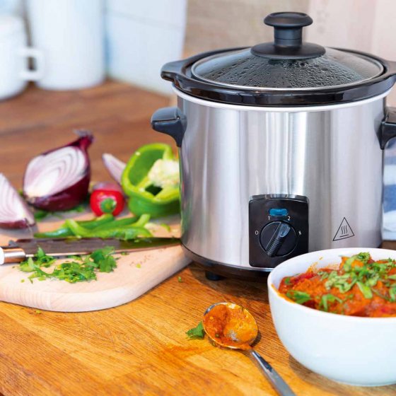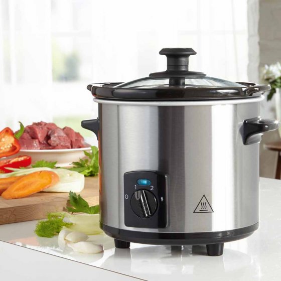 Het wachten wordt beloond: met de MINI-SLOWCOOKER gaart u gerechten gedurende langere tijd op een constante temperatuur waardoor belangrijke aroma's en vitaminen behouden blijven. Met de keuze uit drie temperatuurinstellingen en de uitneembare keramieken pan maakt u moeiteloos de heerlijkste eenpansgerechten als goulash, groente en nog veel meer. Nog een voordeel: omdat de pan een eigen elektriciteitssnoer heeft (145 W), 'blokkeert' hij niet de kookplaats. De inhoud van 2 l biedt ruimte aan max. twee porties. Gemakkelijk schoon te maken, met vaatwasserbestendige glazen deksel en dekselhouder. Oppervlak van hoogwaardig, geborsteld edelstaal. Laat het u smaken.