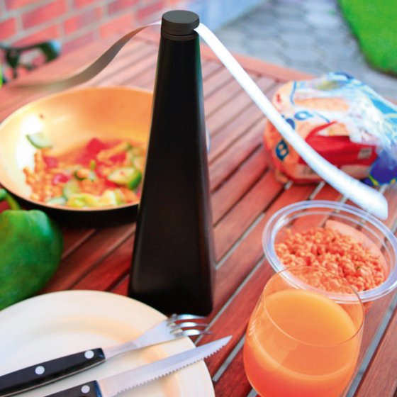 Het is nog maar net warmer of daar komen ze alweer aangevlogen: insecten die het plezier van het buiten eten verpesten. Deze MOBIELE VLIEGENMOLEN biedt dan een geniale oplossing. Geluidloos en op elegante wijze verjaagt het apparaat de lastige plaaggeesten van de ontbijtbordjes en de koffiekopjes, door rond te draaien met zijn beide iriserende vleugels. Nu kunt u in alle rust genieten van het eten, terwijl de vliegenmolen alle vliegen verjaagt binnen een cirkel van ca. 1 m. Dankzij batterijvoeding is het apparaat overal te gebruiken, bijvoorbeeld ook bij het kamperen. Werkt op 2 AA-batterijen (afzonderlijk te bestellen). Afmetingen (b x h x d): 8 x 25 x 8 cm, gewicht: ca. 160 g. Erger u niet langer aan lastige insecten!
