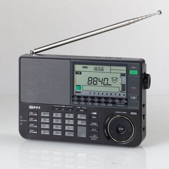 Alle kortegolfbanden (1,711-29,999 MHz), FM met extra informatie via RDS, lange golf (153-519 kHz) en middengolf (520-1,710 kHz, met ver/dichtbij-schakelaar), automatisch/handmatig zoeken naar frequenties en directe frequentie-ingave, zendernamen kunnen individueel worden gewijzigd, verlichte lcd-display met weergave van de batterijstatus en signaalsterkte, alarm, snoozefunctie, slaaptimer, aux-in, line-out en koptelefoonaansluiting.
