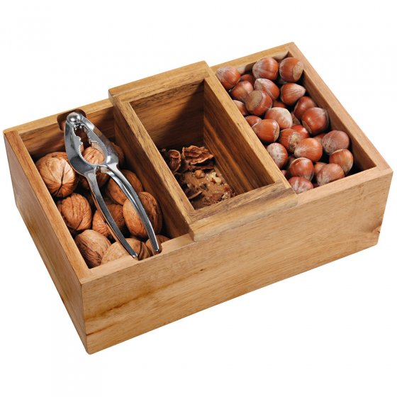 Herfsttijd is notentijd. Maar waar moeten we de doppen laten die vaak ergens achterblijven of op de vloer terechtkomen? De NOTENSCHAAL MET NOTENKRAKER houdt de tafel netjes, terwijl u gezellig blijft zitten. Het geïntegreerde reservoir voor afval is niet alleen uitneembaar en gemakkelijk te legen, maar ook in de grote schaal te schuiven. Zo dient hij als afscheiding voor verschillende notensoorten. Deze set van FSC-gecertificeerd acaciahout is zelfs voorzien van een praktische metalen notenkraker. Een mooie blikvanger thuis en een prachtig cadeau-idee. Afmetingen (l x b x h): ca. 25 x 16 x 10 cm. Dat wordt genieten.
