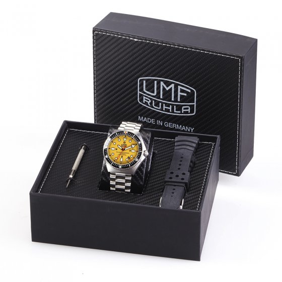 De gevechtzwemmersgroep van het volksleger van de DDR was een elite-eenheid voor maritieme operaties. Hun uitrusting moest robuust en waterdicht zijn, en dat gold uiteraard ook voor het polshorloge. Het NVA-GEVECHTZWEMMERSHORLOGE 'EDITION 4' is een replica van het originele militaire horloge, dat destijds ook door UMF Ruhla werd vervaardigd. Het is geschikt voor duiken met ademapparatuur, heeft een stoot- en schokbestendige afdekking van saffierglas en is dankzij de volledig fluorescerende wijzerplaat ook in het donker goed afleesbaar. Binnenin bevindt zicht een automatisch uurwerk van Seiko. Diameter kast: ca. 43 mm. Bent u op zoek naar een horloge dat vrijwel onverwoestbaar is? Bestel dit exemplaar!