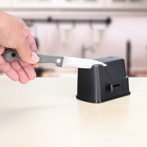 De OPLAADBARE MESSEN- EN SCHARENSLIJPER maakt messen superscherp met één druk op de knop: een dubbele diamantschijf die ronddraait met 1.300 toeren per minuut, doet het werk! Wanneer de batterij volledig is opgeladen, gaat deze in totaal ongeveer 30 minuten mee (opladen via USB-C-kabel, meegeleverd). Behuizing van ABS. Afmetingen (b x h x d): ca. 6 x 7 x 10 cm. Geschikt voor metalen en keramische messen en voor scharen.