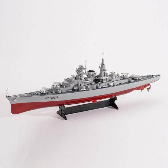 Ze beheersten de wereldzeeën: slagschepen (Engl. battleships), de zwaarst bewapende en gepantserde kapitale schepen uit de 20e eeuw. Met dit RADIOGRAFISCH BESTUURBARE SLAGSCHIP kunt u zelf een representatief exemplaar uit deze scheepsklasse te water laten en nauwkeurig navigeren. Het zeer gedetailleerd vormgegeven model heeft talrijke geschuttorens en boordkanonnen, net als zijn grote voorbeelden. Voortgedreven door een metalen scheepsschroef doorploegt het met bijna 4 knopen (6,8 km/u) het water, de reikwijdte bedraagt ongeveer 80 m (vrije veld). Werking: boot met accu (meegeleverd), afstandsbediening met 2 AA-batterijen (niet meegeleverd). Romplengte: ca. 71 cm. Demonstreer uw handigheid als stuurman en laat alle landrotten zien hoe u zeemanoeuvres maakt.