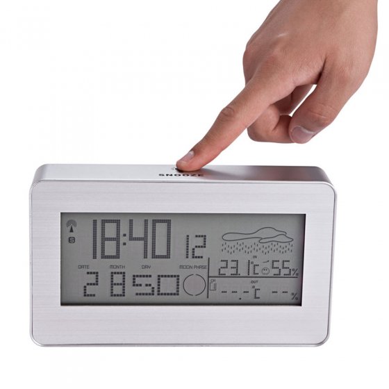 Bij de meeste weerstations moet u heel goed kijken als u alle getallen en symbolen wilt lezen. Het RADIOGRAFISCHE WEERSTATION MET EXTRA GROOT LCD-DISPLAY maakt het u eenvoudiger: alles is in een oogopslag te herkennen. Behalve de met de atoomklok gesynchroniseerde tijd worden datum, dag van de week, temperatuur, luchtvochtigheid binnen en buiten en zelfs de maanstand getoond. Door het aanraken van de rand van de behuizing wordt de blauwe achtergrondverlichting geactiveerd. Werkt op 2 mignonbatterijen en 2 micro-batterijen (afzonderlijk te bestellen). Afm. (lxbxh): ca. 4 x 19 x 10 cm. Ontvang dagelijks een helder overzicht van de weergegevens!
