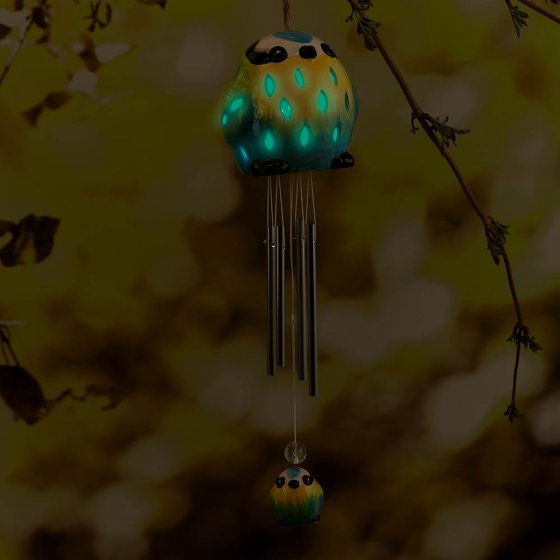 Pimpelmezen behoren tot de meest geliefde inheemse vogels. Ze zijn misschien wel klein, maar dankzij hun verenkleed zijn ze onmiskenbaar. Met het SOLAR-WINDSPEL 'PIMPELMEES' wordt uw balkon, tuin of terras bevolkt door twee van deze levendige vogeltjes. Via een zonnepaneel slaat de grote mees overdag zonlicht op. Bij het invallen van de schemering creëert de van kleur veranderende ledlamp een betoverend mooi lichtspel, dat door de openingen in het 'verenkleed' schijnt. 4 klankstaven (van aluminium) klinken in de wind. Elke pimpelmees is gemaakt van keramiek en met de hand gekleurd. Afmetingen (l x Ø): ca. 58 x 11 cm. Een prachtig spel van klank en licht voor dag en nacht.