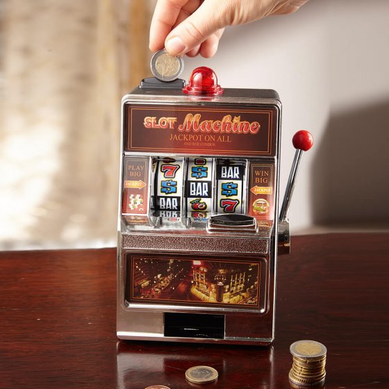 Houdt u van spanning maar wilt u uw inzet daarbij niet verliezen? De SPAARPOT EENARMIGE BANDIET voor thuisgebruik laat de keuze aan u. Voor de spanning functioneert hij als zijn grote broers in Las Vegas: blijven alle 3 rollen zo staan dat de juiste symbolen in het midden verschijnen, dan is het spel gewonnen. En alle munten, die zich in het speelvak bevinden, worden uitgekeerd. Het extra spaarpotvak (inworp aan de achterkant boven) zorgt ervoor dat u uw spaargeld veilig kunt opbergen. Werkt op 2 AA-batterijen (afzonderlijk te bestellen). Afmetingen (b x h x d): ca. 14 x 19 x 10 cm. Met deze casinoklassieker spaart u uw geld