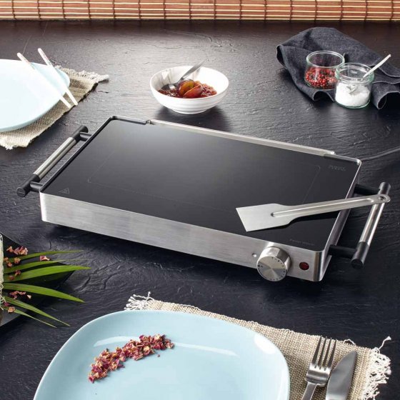 Teppanyaki-grills zijn via Japanse restaurants naar Europa gekomen; sedertdien is hun triomftocht niet meer te stuiten. Deze TEPPANYAKI-GRILL VAN CERAN-GLAS onderscheidt zich door een gaaroppervlak van keramiekglas van het Duitse Schott – hierop kunt u alle soorten vlees, vis, pasta- en groentegerechten behoedzaam en vetarm bereiden. Vrijkomend vet loopt direct in de uitneembare edelstalen opvangschaal en druppelt niet op het verwarmingselement. Aangezien de temperatuur traploos regelbaar is tussen 50 °C en 240 °C, kan deze grill ook als kookplaat worden gebruikt. Afmetingen (l x b x h): ca. 47 x 29 x 6 cm (gaaroppervlak 37 x 23 cm). Werkt op 230 V, 800 W. Op het balkon, in de keuken of in de woonkamer: grillen kan nu overal!