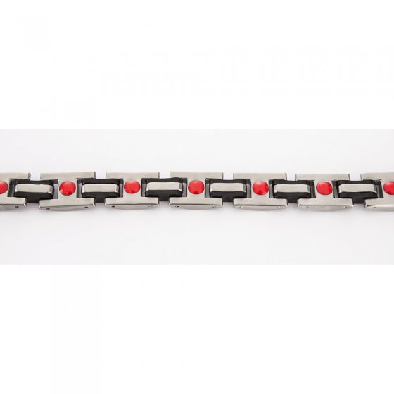 Eén en al kracht: De TITAAN MAGNEETARMBAND 'RED POWER' is gemaakt van titaan, het allergievrije ruimtevaartmateriaal. Aan de binnenkant bevinden zich negen ’Red Power’-magneten. Met een fluxdichtheid van elk 1500 gauss versterken ze, volgens deskundigen, de fysiologische balans en werken ze harmoniserend bij stress, nervositeit of prikkelbaarheid. Ook qua look een sieraad voor mannen: de armbandschakels in natuurlijke titaankleur zijn gecombineerd met schakels met zwart email. Lengte ca. 23 cm. Ontspan met magnetische power! Niet geschikt voor zwangere vrouwen en mensen met een pacemaker.