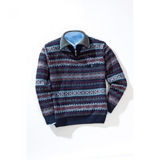 Ontdek het luxe “wol-gevoel”! Deze prachtige TRUI IN NOORSE STIJL is buitengewoon comfortabel. Het geheim zit ‘m in de zeer hoogwaardige materiaalsamenstelling met de beste, 100% jeukvrije Merinowol. Het geeft de trui zijn unieke zachtheid, warmte en comfort. Verwerkt met synthetische vezels zorgt het voor een hoge vormvastheid, robuustheid en verlangt weinig onderhoud. Het smaakvolle, traditionele Noorse patroon in marine, rood en lichtblauw weerspiegelt de hoge kunst van het breiwerk. Van de voorkant naar de achterkant en over de mouwen rondlopend. Een kenmerk van de uitzonderlijke kwaliteit van het merk ‘Rick Armand’ is o.a. het superhandige borstzakje met knoop! Neerleg kraag met rits gebreid in rib. Elastisch ribboord aan manchetten en heupboord. 50 % wol (merino), 50 % acryl; wasmachine geschikt. Een fantastische wintertrui die geweldig comfortabel zit!