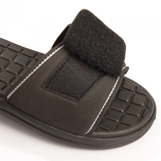 Deze ULTRALICHTE BADSLIPPER is uitzonderlijk en niet alleen ongewoon, maar ook heel voetvriendelijk voor uw voeten! Lichtgewicht (slechts 120 g!) Geeft een aangenaam "gewichtloos" lopen - en is ideaal voor vakantie of weekend en gemakkelijk voor in de bagage tas! Door de zachte zool voelt men niet elke steen , en door het diamant structuur worden ze drooggelopen. Met het klittenband is de schoen volledig te openen en aan te passen aan uw voet. Sneldrogend synthetische bovenmateriaal in zwart en zilver, anti-slip buitenzool. Een Badslipper met fantastische prijskwaliteit verhouding, die uk unt