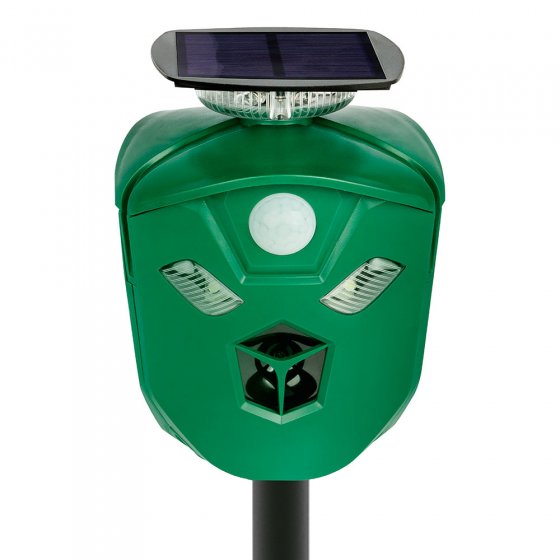 Wilt u voorkomen dat honden en katten uw moestuin als toilet gebruiken en dat vogels de zaden komen opeten? Plaats de ULTRASONE DIERENVERJAGER 360° OP ZONNE-ENERGIE op uw terrein! Zodra één van de 3 infraroodsensoren rondom beweging detecteert, genereert het apparaat ultrasone golven en lichtflitsen; optioneel klinkt er een luid alarm. Voordeel van dit XL-‘arsenaal’: niet alleen dieren worden afgeschrikt, maar ook ongewenste menselijke bezoekers die geen aandacht willen trekken. Afmetingen (l x b x d): ca. 48 x 12 x 12 cm. Werkt op een batterij, opladen via zonnepaneel of via USB (oplaadkabel meegeleverd). Maak van uw tuin een verboden zone!