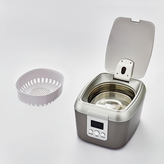 Waarom naar een juwelier of opticien gaan? Vanaf nu kunt u uw bril, sieraden, cd’s en vele andere kleine en gevoelige voorwerpen thuis schoonmaken! De grondige ULTRASONE REINIGER MET 5 STANDEN onderscheidt zich door zijn goede reinigingsvermogen van 46 kHz en blinkend schone resultaten. Kies één van de 5 schoonmaakintervallen van max. 10 minuten, plaats het te reinigen voorwerp en verheug u op geweldige reinigingsresultaten! Het geïntegreerde lcd-scherm telt de resterende tijd af, terwijl het blauwe licht binnen in het apparaat de reinigingsvoortgang aangeeft. Inclusief reinigingsmandje en inzetten voor cd’s en armbanden. Inhoud: ca. 600 ml. Afmetingen (d x b x h): ca. 20 x 16 x 13 cm. Professioneel en snel!