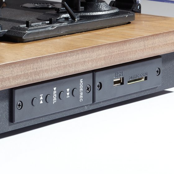 Hebt u nog grammofoonplaten thuis en wilt u graag de muziek daarop ook wel eens onderweg beluisteren of veilig bewaren voor de toekomst? Zet de muziek van uw platen dan over op een USB-stick of op een SD-kaart. Met de ruimtebesparende USB-PLATENSPELER IN RETROSTIJL, die er dankzij zijn mooie hout-look uitziet als een chique platenspeler uit de jaren 70, gaat dat heel eenvoudig. U hebt daar geen laptop of pc voor nodig. Alle opnamefuncties zijn via het paneel opzij te bedienen. Omdat het apparaat ook digitale geluidsdragers afspeelt, kunt u uw opnamen vervolgens direct beluisteren. Werkt op 230 V. Afmetingen (b x h x d): ca. 42 x 12 x 38 cm (bij gesloten kap). Digitaliseer in enkele stappen uw oude vinylschatten.