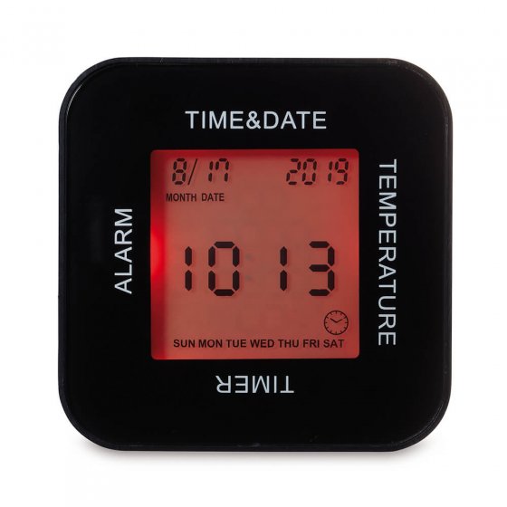 Selecteer 4 functies met een eenvoudige draai: uw cadeau, de intuïtieve multifunctionele wekker „Magic-Colour”, scoort zowel op het gebied van design als functionaliteit: met kalender, exacte timer en betrouwbare thermometer - gewoon 90 graden draaien om te wisselen tussen de functies!Hoe meer taken een apparaat moet uitvoeren, hoe ingewikkelder het is om te gebruiken. De ingenieuze multifunctionele wekker met zijn uiterst eenvoudige bediening en overzichtelijke display laat zien dat hij ook heel eenvoudig is: zonder onhandige toetsen en ingewikkelde instellingen kunt u hem eenvoudig zo instellen dat de gewenste functie aan de bovenzijde kan worden afgelezen. Al de rest regelt deze slimmerik zelf: in een mum van tijd schakelt hij tussen de klok, thermometer, timer en wekker!Klok, thermometer, alarm en kalender in één apparaat!Niet alleen is het instellen van de tijd intuïtief, ook bij het aflezen weet u in één oogopslag welke functie op dat moment is geactiveerd: het grote, goed leesbare display licht automatisch op in de juiste kleur - blauw, turkoois, rood of groen, afhankelijk van de modus - zodat u direct van een afstand kunt zien of de tijd of de timer wordt weergegeven!Om de volgende ochtend op tijd wakker te worden, activeert u de wekker met slechts één draai en gaat u zonder zorgen naar bed - het apparaat wekt u gegarandeerd op de ingestelde tijd. Wilt u al voor u opstapt weten welke dag het is of hoeveel graden de thermometer aangeeft? Niets is makkelijker dan dat - een draai en het technologiewonder presenteert de gewenste informatie duidelijk. U start de dag met wat lichaamsoefeningen en wilt deze timen: nog een draai en de geïntegreerde timer is klaar voor gebruik! Praktische metgezel thuis en onderwegMet zijn compacte afmetingen vindt de multifunctionele wekker overal een geschikte plaats en is hij gemakkelijk mee te nemen wanneer nodig. Als wekker op het nachtkastje in de slaapkamer is hij net zo handig als een eierwekker in de keuken, als een thermometer in de woonkamer en als kalender op het bureau. Omdat hij niet alleen comfortabel in elke zak past, maar ook zeer licht is, is hij ook op reis een praktische metgezel! Werkt op 2 AAA-batterijen (apart te bestellen). Materiaal: ABS. Gewicht: 72 g. Afmetingen (b x h): 7 x 7 cm. Met dit slimme cadeau bent u altijd en overal goed uitgerust!