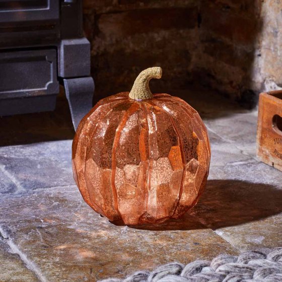 Pompoenen horen bij de herfst, zoals bloemen bij de lente. Daarom mogen ze in geen enkele herfstdecoratie ontbreken. En wat is er mooier dan pompoenvormige glasdecoratie? De glazen VERLICHTE POMPOEN (verkrijgbaar in grote en kleine versie) combineert de natuurlijke vorm van de pompoen met een elegante, glanzende roségoudkleurige look, waardoor het woonkamerraam een etalage wordt! ’s Avonds is er een spectaculair lichteffect. Werkt op 3 AAA-batterijen (afzonderlijk verkrijgbaar). Met geïntegreerde timer. Afmetingen (Ø x h): ca. 19 x 20 cm (groot) of ca. 18 x 15 cm (midden). Tip: een set van een grote en klein pompoen ziet er nog indrukwekkender uit dan één exemplaar!