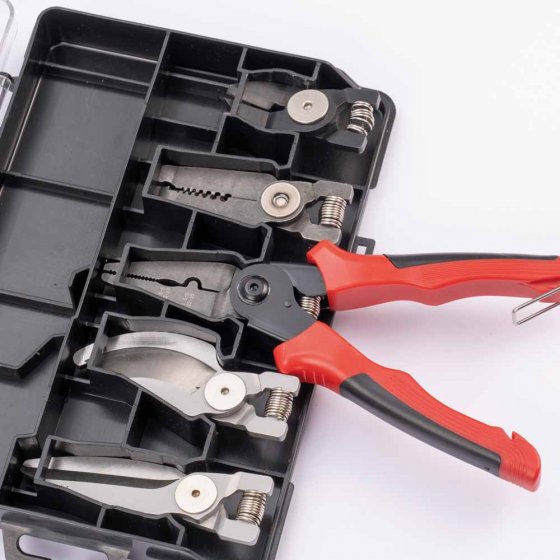 Als doe-het-zelver kunt u nooit genoeg tangen hebben: u hebt ze nodig om vast te houden, te knijpen, te knippen, uit te trekken, te strippen en nog veel meer. Maar in plaats van veel verschillende modellen, hebt u nu alleen nog de nog verbeterde VERWISSELBARE MULTITANG in professionele kwaliteit nodig. In plaats van tot nu toe 5 opzetstukken combineert deze set nu 6 opzetstukken in één! Deze kunnen binnen enkele seconden zonder gereedschap worden verwisseld en zitten stevig vast. Dit bespaart ruimte, tijd, lang zoeken en is bovendien uiterst praktisch. Lengte tang zonder opzetstuk: ca. 16 cm. Meer kracht voor uw projecten! Zes functies, één tool – sneller en eenvoudiger!