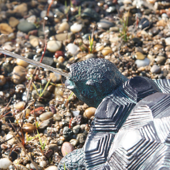 "Is deze schildpad echt?" Het lijkt bijna - want de WATERSPUITENDE ZONNE-SCHILDPAD ziet er bedrieglijk vergelijkbaar uit als zijn natuurlijke voorbeeld. En hij heeft zelfs een verrassing in petto... Want bij zonlicht spuugt hij een tot 1,5m lange waterstraal in een hoge boog in uw vijver. Het extra grote zonnepaneel (ca. 29 x 25 cm) met bijbehorende grondpin vangt ook nog de laatste zonnestralen op. Zo kunt u van uw "dierlijke" decoratieve waterspuwer bij direct zonlicht tot in de avonduren genieten. Het zonnepaneel is via een 3 m lange kabel (IP 44) op een krachtige pomp aangesloten. Deze levert de schildpad water - zonder enig lawaai en extra kosten. Gemaakt van weerbestendig Polyresin. Met decoratieve groene antieke patina, afmetingen ca. 17 x 11 x 25 cm. Een echt sprankelend idee voor de tuin - dat zullen ook uw buren moeten toegeven!